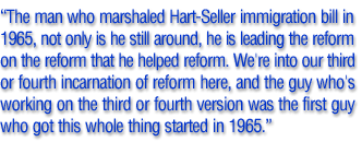 Well, LBJ is no longer available to face accountability, but I do know that the man who marshaled the bill through the Senate is still around. The man who marshaled Hart-Seller immigration bill 1965, not only is he still around, he is leading the reform on the reform that he helped reform. We’re into our third or fourth incarnation of reform here, and the guy who’s working on the third or fourth version was the first guy who got this whole thing started in 1965. Now, before I reveal his name, let me pass on to you some of his quotes in 1965 as he then led the reform we are about to reform. Who do you think it is? Here’s what he said. (interruption) Snerdley thinks he knows who it is, and I’m sure many of you think you know who it is.