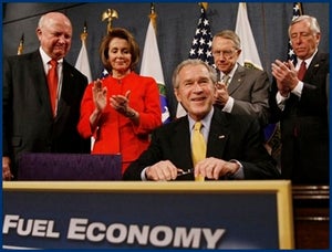 RUSH: The energy bill. What a disaster. It’s just an absolute disaster. ‘Energy Bill Boosts Fuel-Economy Standards — One-hundred watt lightbulbs to vanish,’ and you’re going to get stickers on your car saying how much your carbon footprint is, what your emissions are. In addition to the sticker over the price, you’ll get a sticker telling you how much your car is going to pollute, like all the warning stickers on the sun visors that make you think you’re an idiot. Jane Harman (D-CA) said, ‘In this bill, we ban by 2012 the famously inefficient 100-watt incandescent bulb.’ The question remains now: this energy bill creates no new energy. In fact, it stands in the way of the creation of energy. The question ought to be: ‘How many miles will your next car get per new lightbulb?’ I haven’t seen the bill myself. I doubt members of Congress have, either. They just signed the damn thing. But does the bill titled ‘energy bill’ end with a period or a question mark? is my point, because it could just as easily be called, ‘What Energy Bill?’ Petroleum? Nothing in it. Nuclear? Nothing in it. ANWR? Nothing in it. The big brag here in the bill, the big talking point is that the CAFE Standards, the fuel, the mileage standards for cars increase from 25 miles per gallon to 35 miles per gallon in 13 years.