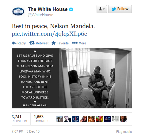 You know, I’ve known people with healthy egos, and they’re off putting, folks. I’m sure you’ve known them. But this, the official White House tweet upon the death of Nelson Mandela is a picture of Obama in the jail cell, after the jail cell has been closed and memorialized itself, just as President Obama published a picture of himself sitting in the same seat in the same bus that Rosa Parks refused to move to the back of the bus on. (laughing) You know, wait ’til Obama finds out the White House did this.
