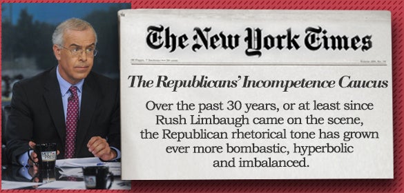 “Over the past 30 years, or at least since Rush Limbaugh came on the scene, the Republican rhetorical tone has grown ever more bombastic, hyperbolic and imbalanced. Public figures are prisoners of their own prose styles, and Republicans from Newt Gingrich through Ben Carson have become addicted to a crisis mentality. Civilization was always on the brink of collapse. Every setback, like the passage of Obamacare, became the ruination of the republic. Comparisons to Nazi Germany became a staple.”