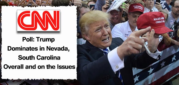 In the latest CNN poll, Trump leads by 16 points in Nevada, and by 18 points in South Carolina. Trump is at 38% in Nevada, Ben Carson second with 22%. In South Carolina, Trump doubles the support Ben Carson has, 36% to 18%. No other candidate comes close to those top two, in either state, Nevada or South Carolina. The third place candidate in each case has less than 10%. And his approval on is best to handle numbers on the economy are through the roof.