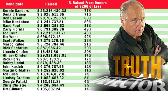 You take Bernie Sanders, who’s second only to Hillary Clinton, but I count his $26 million as more powerful than her $29 million for this reason. Seventy-seven percent of the people that have given money to Bernie Sanders are people that have given less than 200 bucks. That’s a lot of people, folks. That’s a lot of enthusiasm. Now, you might say, “Well, yeah, but what if he doesn’t get the nomination? He’s not gonna get the nomination.” His people are not gonna vote Republican, and they’re gonna stay wired. He’ll keep them wired. Bernie will keep them wired. They will vote, or a good percentage of them. If Hillary’s the nominee — depends on how screwed they think Bernie gets in this. There’s a lot of that now. I mean, the Bernie Sanders people think CNN screwed their guy by proclaiming Hillary the winner.