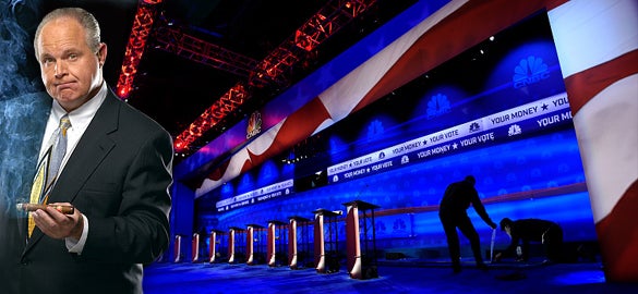RUSH: Big Republican debate tonight, Colorado, opposite the second game the World Series. Cookie just sent me a note, “Do you have any predictions for the debate tonight?” No. None. No clue. I mean, not along the lines of earlier debates when I was able to predict what the media was gonna do and so forth. I predict that there will be a lot of effort on the part of the media to hammer the fact that Trump may have peaked and it could be over, sayonara, so forth. And I fully expect the moderators to ask these various candidates if they endorse the Republican budget deal.