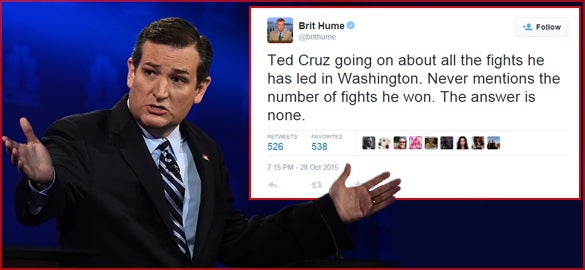 RUSH: Brit Hume tweeted — I’m paraphrasing — “Ted Cruz going on and on about all these fights that he’s led. Well, that isn’t any big deal. How about the fights that you’ve won? The answer to that is none.” A Fox News commentator watching the debate Wednesday night and that’s what he noted.
