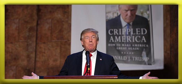 RUSH: Back to the Donald Trump press conference today to launch his new book, Crippled America: How to Make America Great Again. The whole thing was a Q&A, or the vast majority of it was. It was not like a Trump campaign appearance. It was similar. A Trump campaign appearance, he goes up, like the Rush to Excellence Tour, except he uses a podium and I didn’t, most of the time. But still, he’s up there, hour, hour and a half, maybe hour 45 minutes just doing stream of consciousness stand-up, and you never know where it’s gonna go.