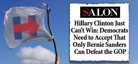 RUSH: Salon.com — Salon magazine, left-wing extraordinaire — headline: “Hillary Clinton Just Cannot Win: Democrats Need to Accept That Only Bernie Sanders Can Defeat the GOP.” Salon is — I don’t know — demanding, advocating, editorializing that Hillary get out of the race. They are suggesting that she surrender. She can’t win. She can’t beat Trump or Cruz or whoever. Only Bernie Sanders can. Salon.com: Wacko, leftist, extreme radicals to you and me; mainstream Democrat thought to them. I’m going to have to make a note because I’m not going to have time to develop this today.