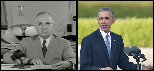 As opposed to Independence Day, as opposed to Flag Day, as opposed to Labor Day, we are honoring the dead. Anybody find it coincidental Obama’s over in Japan lamenting the bombs at Hiroshima, Nagasaki, on Memorial Day? Now, he’s coming back; I mean, he’s on his way back now. He’ll be there for the wreath-laying. I don’t think the timing is a coincidence, myself. I really don’t. Let’s go back. And your phone calls are coming up, folks. A lot of good ones, in fact, are hanging on. So we’ll get to ’em ASAP, but I want to go back to August 6, 1945, aboard the USS Augusta in the mid-Atlantic, President Harry Truman announcing the US dropped an atomic bomb on Hiroshima, Japan.