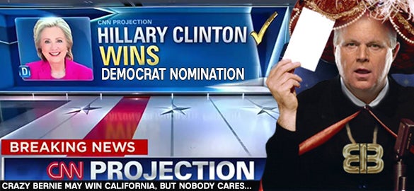 RUSH: The California Democrat primary is Tuesday, and it’s nip and tuck, according to the polls, could go either way. Bernie Sanders could even win it. It doesn’t matter. She’s still gonna get the nomination.