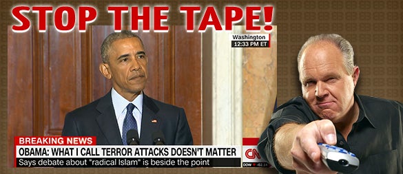 I’ve gotta paraphrase this. Obama says something along the lines of (imitating Obama), “Throughout all of this, my critics, my friends on the other side of the aisle have been saying that I’m not taking any of this seriously ’cause I refuse to use the label, ‘radical Islam.'” And after saying that, he started asking questions. He said (paraphrasing), “Is calling them ‘radical Islamists,’ is it gonna change their strategy? Is it gonna make them cower in fear? Is it gonna make them run away? Does it increase our odds of beating them by calling them ‘radical Islamists’? What difference does this label make?”
