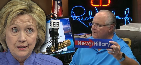 By the way, speaking of Hillary Clinton, we are offering a premium, RushLimbaugh.com’s bumper sticker promotion, and it is phenomenal.  These bumper stickers are flying off shelves.  You know, Father’s Day is this Sunday.  You could give dad a subscription to Rush 24/7 and the Limbaugh Letter and get the bumper sticker for free.  Here’s what it is.  We’ve taken Hillary’s own logo and converted it into a bumper sticker.  I’m showing it here on the Dittocam.  It’s “Never Hillary.”  It’s her blue color; it’s her red arrow — and we put “Never Hillary.”