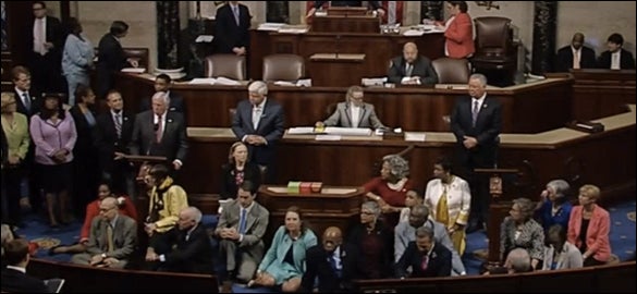 RUSH: I don’t know if you can understand it. They are saying, “No break! No bill! No break! No bill!” and what they started was Pelosi saying, “A moment of silence, a moment of peace, a moment of truth.” And then there was a moment of silence. For so many names to remember. Think she was talking about Democrats gunned down in Chicago? Kind of doubt it. Kind of doubt that’s what was in her mind at the moment.