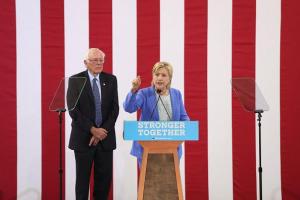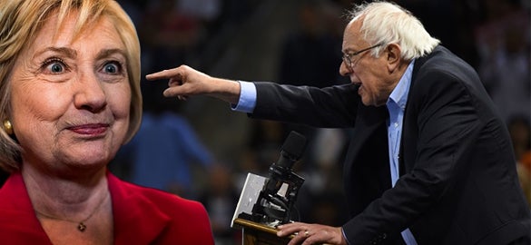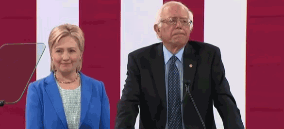 So just a couple little specifics points. In the first place, watching this thing was hilarious, ’cause there was Bernie up there being Bernie. And standing next to him was Hillary, who looked like a bobblehead doll. She’s standing there smiling with this vacant smile, like the last place she wanted to be was playing second fiddle to this old codger. But she had to bite the bullet, and she had to do it.