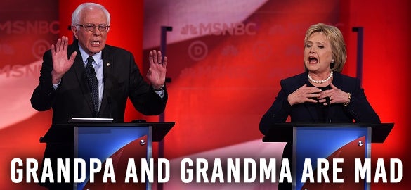 Okay, there was more. Bernie said we all have to stand together. There’s nothing in common we all have to stand around. I don’t know what it would be. But anyway, he had to cede the stage. He went on for a long time. The crowd was eating it up. She just stood there nodding her head, literally like a robot. But it was her time. Grandma takes the stage and starts screeching.