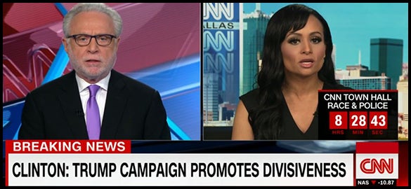 And she said, “Wolf, you don’t get to do that, because we don’t get to do that. Whenever something happens and the Tea Party’s not involved, you and other networks make tracks to indict the entire Tea Party movement, when it’s not even involved, Wolf. Every time one person not even affiliated with the Tea Party does something, the entire Tea Party is ripped to shreds on every network. So we’re not just gonna pick and choose which organizations get to do this or not. These are people actually leading the movement, Wolf, Black Lives Matter leaders are saying that they want to destroy the cops.”