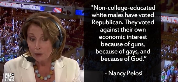 PELOSI:  I think that so many times white, non-college education — educated white males have voted Republican. They voted against their own economic interests because of guns, because of gays, and because of God, the three G’s — “God” being the women’s right to choose.