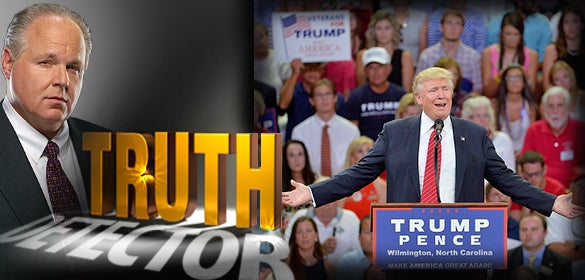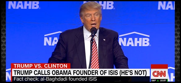 RUSH: I meant to mention this earlier. CNN has started doing something that’s new. They do instant fact-check on Donald Trump. They may do it on Hillary; I haven’t seen it. Here’s what they do. I just saw it. They just ran a graphic — a chyron graphic, one of those banners at the bottom of the screen — and here’s what it says verbatim: “Trump Calls Obama Founder of ISIS (He’s Not).” And in a very tiny font underneath that, they make some reference to CNN’s fact checker. But you don’t see that.