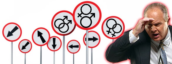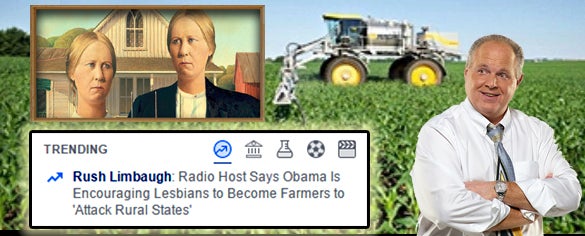 “In his latest crazy on-air rant, conservative radio host Rush Limbaugh accused ‘the Obama Regime’ –” they’ve got that in parentheses, “of trying to unleash on red states a scandalous scourge of lesbian farmers. ‘What they’re trying to do is convince lesbians to become farmers,’ he told listeners. There’s a specific sinister motive to the sapphic shift, Limbaugh claimed: Ruining conservative voting blocs.”