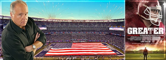 RUSH: By the way, folks, a reminder: If you missed the first half hour, the first hour of the program, make sure you go to RushLimbaugh.com sometime today or tonight and revisit the opening monologue on a new movie out called Greater. I don’t want to repeat what I said, but it’s all there. It’s a new movie that I really hope as many of you who can get a chance to see it. And that’s all I’ll say. I don’t want to waste any more time. Not waste time. I never waste time. But I previously discussed it. Just go to RushLimbaugh.com and find out why if you missed the first hour of the program.