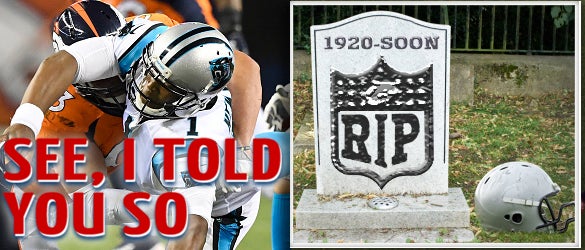 And they’re upset that that didn’t happen to Cam Newton ’cause there were clearly a bunch of different times he could have very easily had a concussion, and nobody made a move to help him — the spotters up in the press box, the doctors, the neurologists, nobody — and it says right here: Fans, critics, pundits, reporters up in arms over the fact that Newton was allowed to continue playing after the hits. What do you expect? It’s the final drive. The Panthers are down four. They need to get into field goal range.