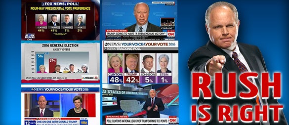 Quick review of the polls and then we’ll get back from the break we’ll sound bites to back all this up. Fox News: “Clinton’s Lead Cut in Half.” She was up six; now she’s up three in the Fox News poll. The Drive-Bys take this seriously. They hate Fox News, but they believe in the Fox poll. The interesting thing about the Fox poll is that even the Fox poll oversampled Democrats by seven percentage points. Democrats sampled are 44%, Republicans 37%. The Democrat advantage is around 2.5 to three. I’m not complaining. Don’t misunderstand.