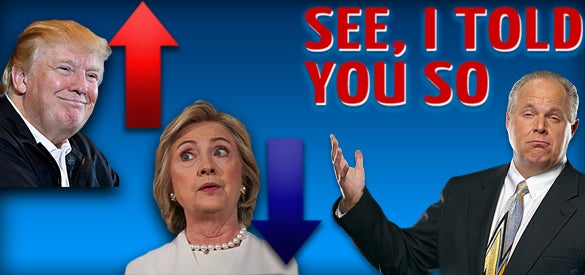 RUSH: Wait a second! Wait a second. You mean if it’s about jobs and the economy and the state of the country, Trump could win? When did that change? ‘Cause that’s always been what Trump’s about. Why wasn’t it two weeks ago, Trump could win? This is what I mean, folks. Everything that you’ve heard up ’til now, you may as well just forget it because these people are switching on a dime here and it’s the polls that are doing it. I’ll guarantee you if tomorrow the polls show Hillary back up 10 to 12, these people are gonna say, “It’s over! Trump never had a prayer.” Nobody knows, folks. Trust your own instincts. Nobody knows.