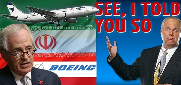 “Why would the Republicans want their fingerprints on a deal that allows the world’s state sponsor of terrorism to nuke up?” Well, it turns out it was Boeing. Not totally, but one of the reasons. Remember this, Mr. Snerdley? The Iranian national airline is essentially falling apart, and because of sanctions and freezing of their money in our banks, they haven’t been able to modernize enough their infrastructure, including purchase new aircraft. So the Corker Bill was about getting the sanctions lifted and approving Obama’s deal because Boeing wanted to go sell the Iranians new commercial airliners.