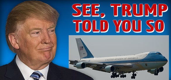 Well, it turns out — this is from the U.K. Daily Mail. Headline: “Trump Was Right About Air Force One: Pentagon budget documents show Boeing program is slated to cost more than $4.2 billion — Government budget and procurement documents show that President-elect Donald Trump was right to insist that the new Air Force One jets will cost taxpayers more than $4.2 billion.”