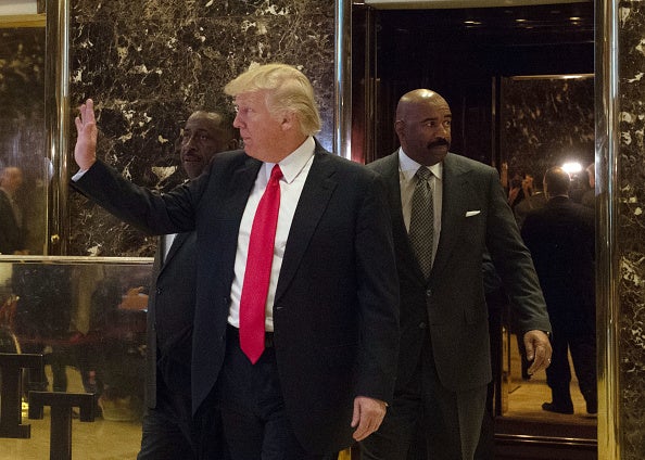 Yeah? Is it thumbs up or thumbs down? It doesn’t matter. (interruption) All right. Well, Steve Harvey, he hosts game shows on TV. He’s been a syndicated radio host and may still be. He happened to visit Trump yesterday. He went to Trump Tower, and Trump escorted him down the elevators and into the lobby of Trump Tower. And he was there with… Was it Jim Brown that he was also with yesterday? (interruption) Yeah, but there was somebody. (interruption) Oh, maybe it was early in the week.