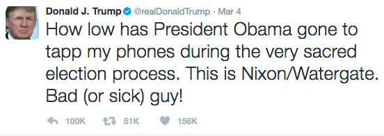 Now, they would say, “No, no, no. This is a serious charge. We must look into this. The seriousness of the charge is what requires us to get to the bottom of it.” Okay, fine. What about the seriousness of the charge that Donald Trump has made that Barack Obama and his administration wiretapped or surveilled Trump Tower? Because in fact we know that they did. They surveilled a server in Trump Tower hoping to find linkage between Trump and his businesses and Russian banks. We know that it happened.