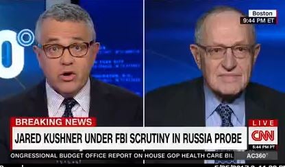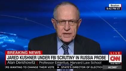 RUSH: Read back what you just said. You used to two terms unknown to any federal prosecutor. Person of interest, yep, might be the title of a TV show and you might see it on CNN every week, but it’s nothing we use, Mr. Cooper. And a focus? That just doesn’t happen. So it’s a very polite slapdown. Essentially, “You don’t know what you’re talking about. You don’t have a story here. Everybody’s a witness in a national security investigation. Everybody’s trying to influence Washington. That’s what they do. It isn’t illegal nor is it surprising. Up next, Professor Dershowitz. Same show. After Mukasey says that it’s not surprising Kushner’s considered a witness, Dershowitz added —