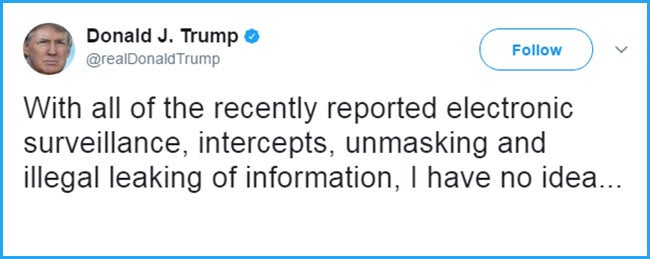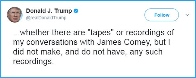 First one: “With all of the recently reported electronic surveillance, intercepts, unmasking, and illegal leaking of information, I have no idea whether there are ‘tapes'” that’s in quotes “or recordings of my conversations with James Comey. But I did not make and do not have any such recordings.” So Trump has flipped the narrative! He did not say that there aren’t any. He said there might be but he doesn’t know about it — and if there are, he didn’t do it, and he doesn’t have ’em. Well, now, the media has gone nuts with this.