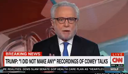 There were no freaking tapes from the get-go is the point. It’s still breaking news. Trump did not make tapes of Comey talks. You can see the sadness. You can see the long faces, the disappointment. Wolf Blitzer’s beard’s even growing. They got four people talking about this now, four experts weighing in. They got their political reporter, they got their political analyst, they got their anchor, and they got their congressional correspondent.