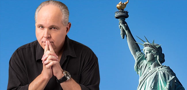 RUSH ARCHIVE: The Emma Lazarus poem, “Give me your tired, your poor, your hungry, huddled masses,” blah, blah, blah, does not and never has appeared on the Statue of Liberty. It was a poem written in a contest to raise money to build the pedestal for the Statue of Liberty. It was not even put on display inside the exhibit, inside the pedestal until years later. “The New Colossus” is the title of it. It was written in 1883. In 1903, 20 years later, it was engraved on a bronze plaque and mounted inside the Statue of Liberty. You don’t go to the Statue of Liberty, wander around outside and see “The New Colossus” as part of the design on the outside of the Statue of Liberty.