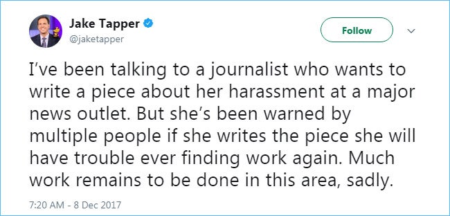 RUSH: Look at Jake Tapper here, a tweet: “I’ve been talking to a journalist who wants to write a piece about her harassment at a major news outlet. But she’s been warned by multiple people if she writes the piece she will have trouble ever finding work again. Much work remains to be done in this area, sadly,” writes Jake Tapper.