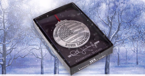 RUSH: No, no. We still have a few. We still have a few Christmas ornaments, brand-new this year, each one is handmade. I’m gonna be honest. The Christmas ornaments in the past, compared to this one, have been a little flimsy. But this is forged. Well, it’s steel. It looks like pewter. But it’s the EIB logo. And there’s still some left at the EIB Store. I’m not sure about shipping. I’m not sure if we’ll get ’em out to you this week or not.