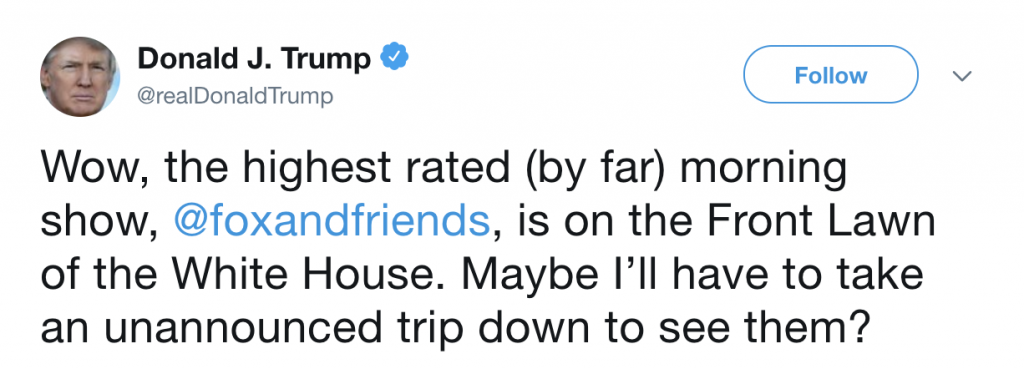 RUSH: I mentioned the impromptu gaggle that happened today. Trump was watching TV in the Oval Office, and he sees that his favorite show is set up on the lawn, and that would be Fox & Friends. He sees Steve Doocy out there. So Trump sends out a tweet, “I think I’ll go out there and surprise my buddies at the most highly rated morning show, Fox & Friends.” So he walks out there. Secret Service in tow. The Drive-Bys mobbed him — I mean, literally mobbed him — as he’s on his way to where Doocy is set up. And I mean mobbed. And it was almost like a rock star gets mobbed, except in these people’s questions it’s, “Mr. President, when are you gonna die?