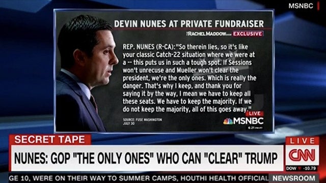 NUNES: So therein lies… So it’s like your classic Catch-22 situation where we were at a… This puts us in such a tough spot. If Sessions won’t un-recuse and Mueller won’t clear the president, we’re the only ones, which is really the danger. That’s why I keep — and thank you for saying it, by the way. I mean, we have to keep all these seats. We have to keep the majority. If we do not keep the majority, all of this goes away.