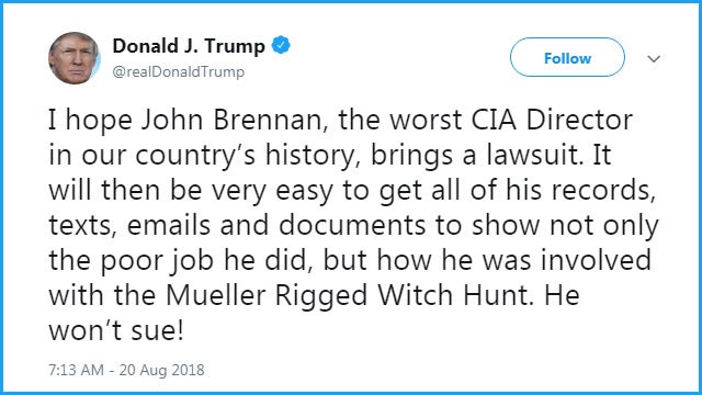 He said “I hope John Brennan, the worst CIA Director in our country’s history, brings a lawsuit. It will then be very easy to get all of his records, texts, emails and documents to show, not only the poor job he did, but how he was involved with the Mueller Rigged Witch Hunt.” And then Trump goes on to predict that he will not sue.