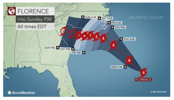 It’s gonna pause and then turn back southwest, and it’s gonna start perhaps hugging the North Carolina-South Carolina coast before it goes inland. That is one powerful high-pressure area that’s steering this thing back to the southwest, when it’s basically on a north-northeast track right now. But if you go back and you look at the forecast tracks four or five days ago, they were practically right at Wrightsville City, North Carolina, splitting the state.