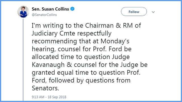 RUSH: Right on. Let me read her tweet. This is what Doug thinks is genius. Susan Collins says, “I’m writing to the Chairman & [ranking member] of Judiciary [Committee] respectfully recommending that at Monday’s hearing, counsel for” the woman, lawyers for the woman, “be allocated time to question Judge Kavanaugh & [lawyers] for the Judge be granted equal time to question [the accuser], followed by questions from Senators.” Now, as you point out, there are no female Republican senators on the Judiciary Committee. So what do you think is a stroke of genius about this?