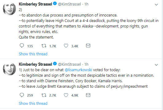 Another interesting thing. Hang on. Another new development. But hang on here just a second. Here’s a second tweet before it Kimberley Strassel: Lisa Murkowski, Republican, Alaska, today voted “to abandon due process and presumption of innocence. –to potentially leave High Court at a 4-4 deadlock, putting the loony 9th circuit in control of everything that matters to Alaska,” her state, “development, prop rights, gun rights, enviro rules, etc.” Lisa Murkowski has made “[q]uite the statement.”