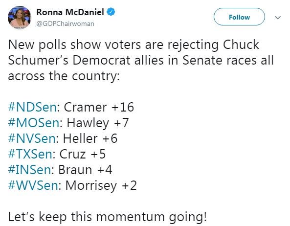 The Drive-Bys are saying they just sense it. They get a feeling out there that this whole episode has sort of tamped down all of your enthusiasm to show up and vote. Now, how could anybody know that? Fact, if you look at the latest polls that Ronna McDaniels sent out from the RNC, some of these are incredible. Let’s see. (summarizing) In North Dakota Republican up 16. In Missouri, Josh Hawley has pulled ahead of Claire McCaskill by seven points. That’s outside the margin of error. That is huge. In Nevada, Heller is up six. Ted Cruz is up five.