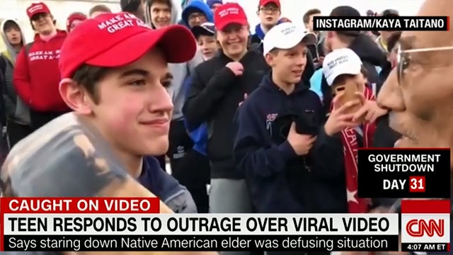 And the kid has said, “Look, I made a decision to smile and not react. If I did anything else, the odds of it breaking down and falling apart would have been great.” I’m paraphrasing what he said, but he said he made a studied decision to stand there and try to appear friendly to the frail old Indian Vietnam War vet pounding on his war drum. A still shot of that is what ended up being reported as arrogant, condescending, smirky, jerk white guys wearing Trump hats, intimidating frail Indian leader.