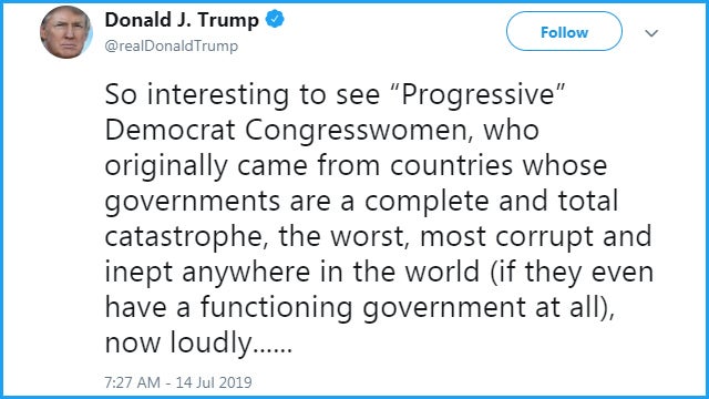 I want to share with you the two Trump tweets. “So interesting to see progressive Democrat congresswomen who originally came from countries whose governments are a complete and total catastrophe, the worst, most corrupt, inept anywhere in the world, if they even have a functioning government at all, now loudly and viciously telling the people of the United States, the greatest and most powerful nation on earth, how our government’s to be run. Why don’t they go back and help fix the totally broken and crime infested places from which they came, then come back and show us how it’s done. These places need your help badly. You can’t leave fast enough. I’m sure that Nancy Pelosi would be very happy to quickly work out free travel arrangements.”