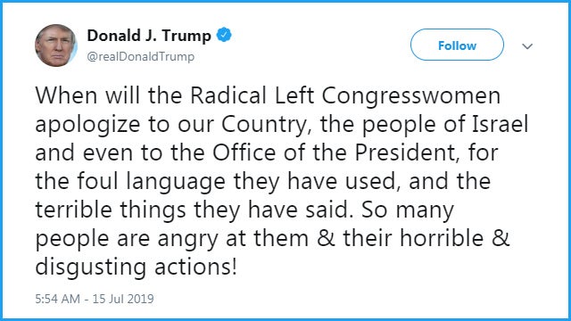 RUSH: Now let me go to the second Trump tweet when he found out everybody was aghast and appalled, he doubled down. Next tweet: “When will the Radical Left Congresswomen apologize to our Country, the people of Israel and even to the Office of the President, for the foul language they have used, and the terrible things they have said.” Trump said, “So many people are angry at them & their horrible & disgusting actions!”