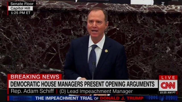 SCHIFF: President Trump undermined the integrity of our free and fair elections by pressing a foreign power to influence our most sacred right as citizens. Our right to freely choose our leaders. And he threatened our national security by withholding critical aid from a partner on the front lines of war with Russia, an aggressor that has threatened peace and stability on an entire continent. In so doing the president sacrificed not only the security of our European allies, but also our nation’s core national security interests.
