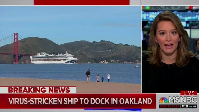 The headline: “Ship with 21 Coronavirus Patients About to Dock.” They’re now showing that ship as it is approaching the Bay Bridge. It will go underneath the Bay Bridge and will dock somewhere. “Ship with 21 Coronavirus Patients About to Dock.” If you live in the San Francisco Bay area and you are watching the Drive-By Media, you are essentially watching a floating — what? — there are 21 people with the coronavirus on board that ship, and it’s going to be allowed to dock in your town. It’s just amazing. I wonder how many aboard the ship have the flu? Nobody knows.