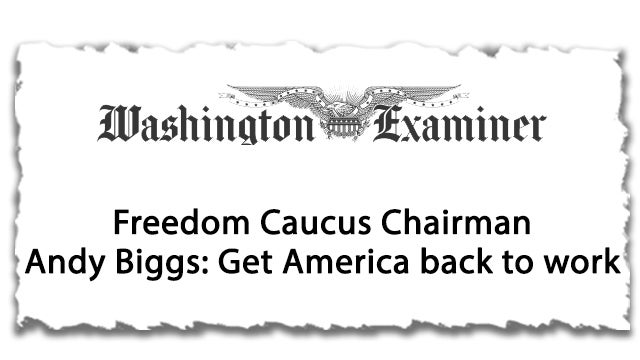 RUSH: Hey, take a look at this, folks. Somebody is joining me in my chorus. This is from the Washington Examiner: “Freedom Caucus Chairman Andy Biggs…” The Freedom Caucus is a conservative group in the Republican caucus in the House of Representatives. “Freedom Caucus Chairman Andy Biggs: Get America Back to Work.” Amen!