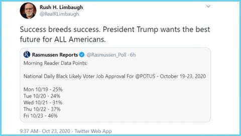 RUSH: "Trump reaches critical 52% approval rate entering final election stretch." That is considered historically Holy Grail of reelection numbers.